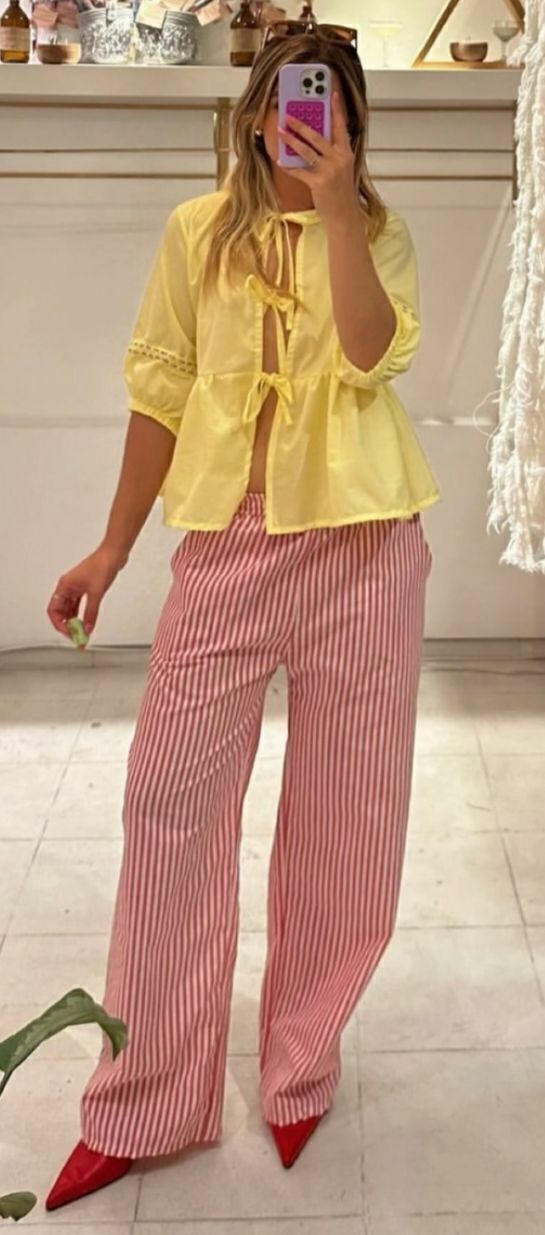 Blusa con manga corta, globo. Siguiendo la tendencia que reinará este 2024/25 tiene tiras delanteras para atar y volado.