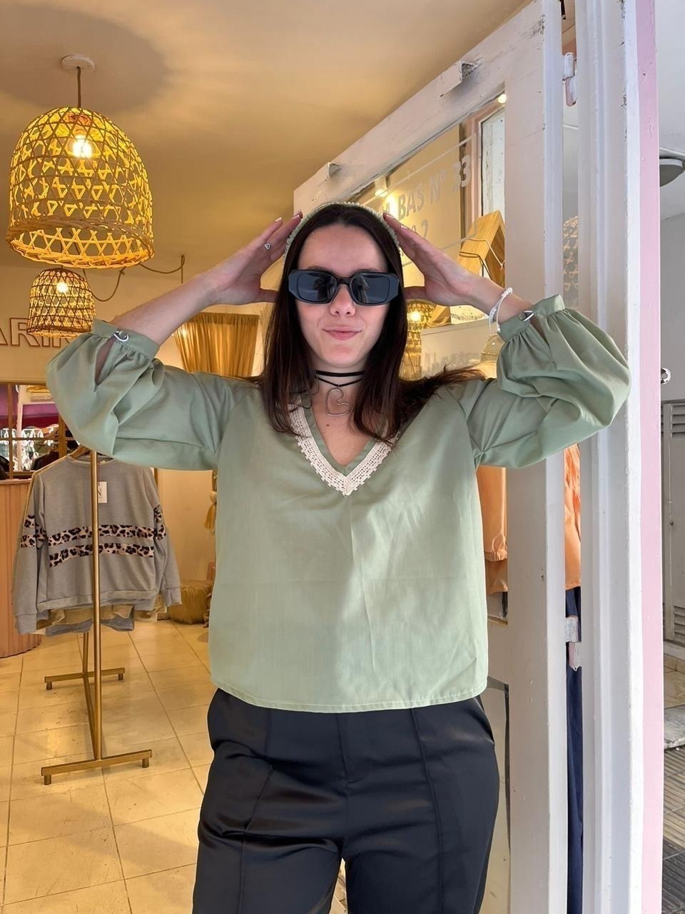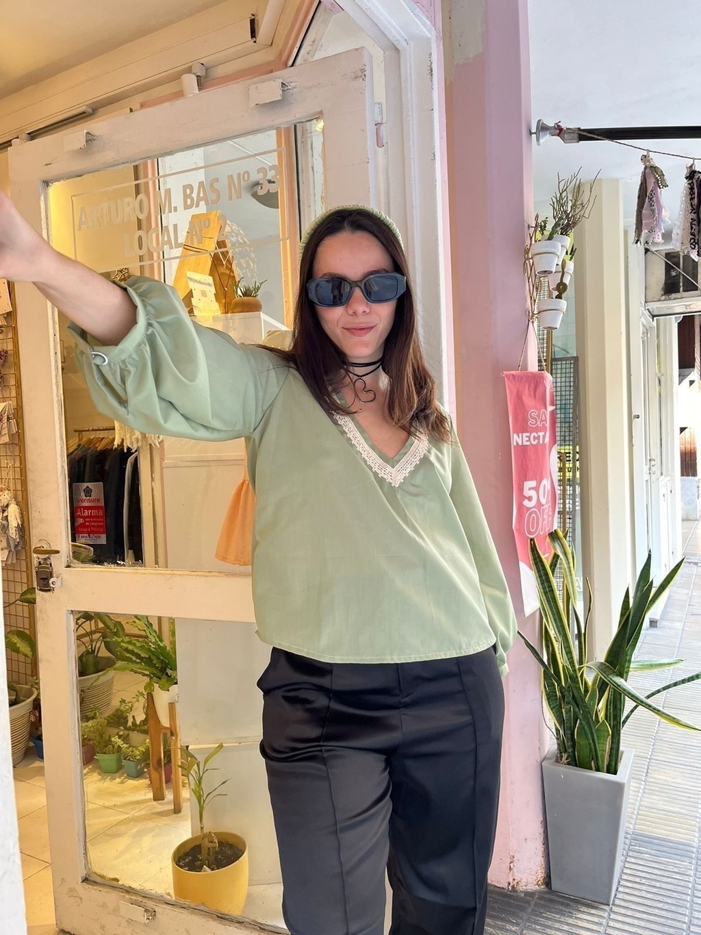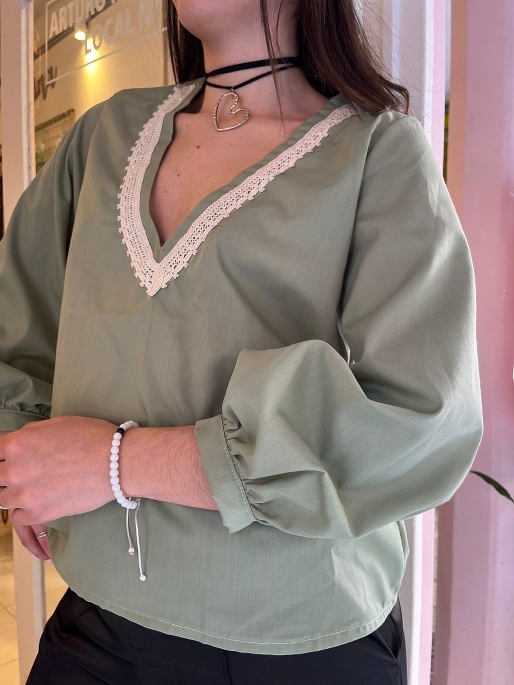 Blusa manga globo , con un delicado botón en el puño , escote en v con puntillas.